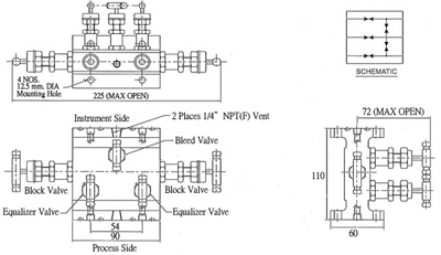 Electra Five Way manifolds are designed for natural gas application. The five manifolds consist of two shut-off valves, two equalizing valves and a single vent valve which takes the place of the conventional piped-up 5-valve manifold generally found on field meters of gas service differential pressure instrument