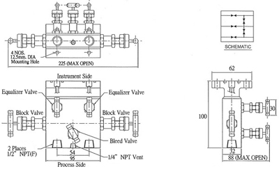 Electra Five Way manifolds are designed for natural gas application. The five manifolds consist of two shut-off valves, two equalizing valves and a single vent valve which takes the place of the conventional piped-up 5-valve manifold generally found on field meters of gas service differential pressure instruments.